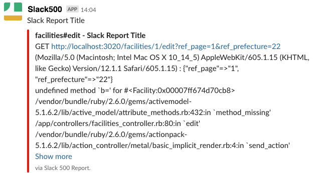 Slack500 is a gem that notifies exceptions raised by Rails to your Slack channel using incomming WebHooks URL.